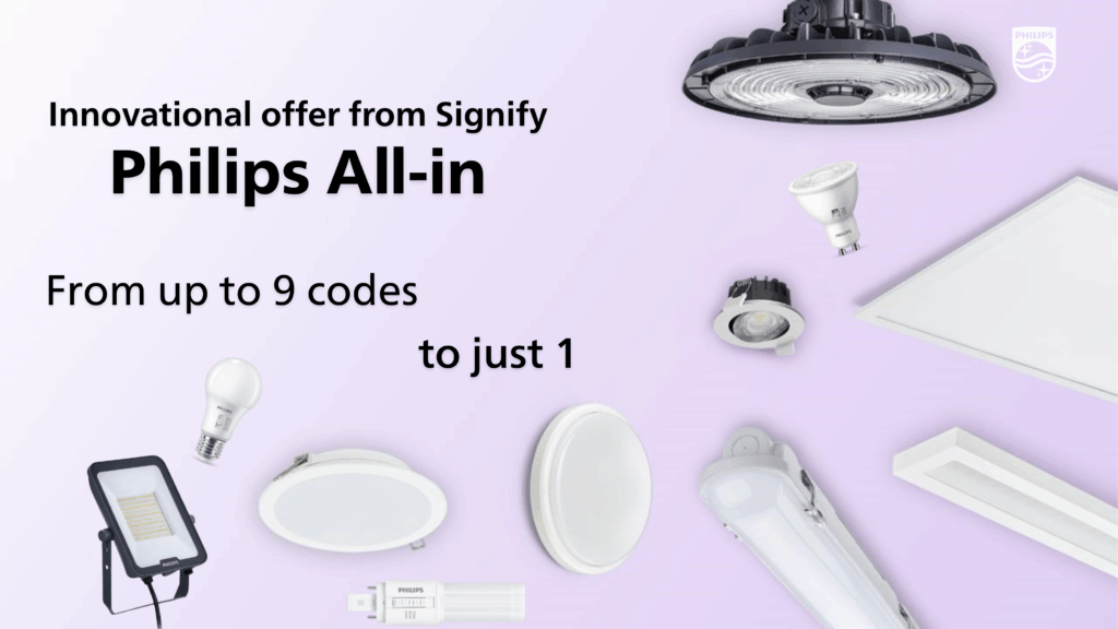 Discover Philips All-in LED luminaires and light lamps with an innovative solution that simplifies inventory management, reduces the number of product codes from up to 9 to 1, and provides complete flexibility in selecting technical parameters. With Multi Lumen and Multi ColorTemp features and an integrated switch, installers and users gain convenience, while you gain space, savings, and a new way to grow your business.